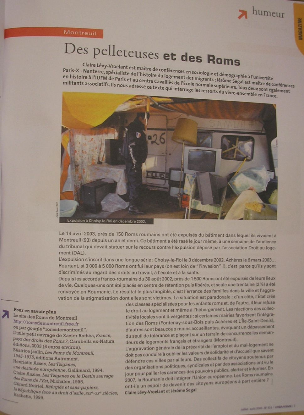 2. « Les Roms de Montreuil et d'ailleurs - des immigrés européens particuliers », Les Temps Modernes, n°624, 58ème année, mai-juillet 2003, pp. 223-230 (article écrit avec C. Lévy-Vroelant) (PDF ou en cinq photos, 1, 2, 3, 4 et 5) |
