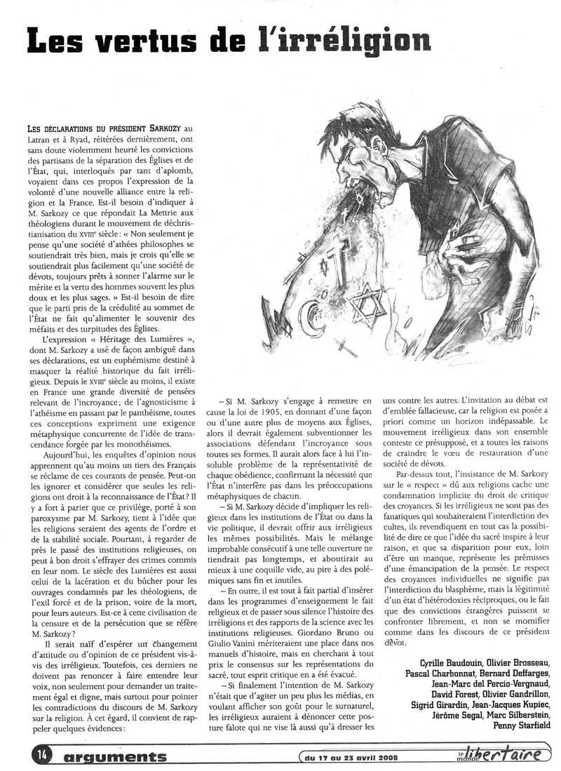 14. "Les vertus de l'irréligion", Le Monde libertaire, 17-23 avril 08, p. 14 (article collectif cosigné) |